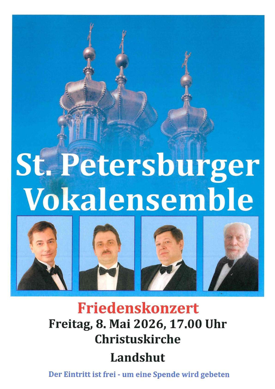 Am Freitag, 8. Mai 2026, jährt sich das Ende des Zweiten Weltkriegs zum 81. Mal – ein Datum, das in diesem Jahr in der Landshuter Christuskirche mit einer besonderen musikalischen Veranstaltung begangen wird. Statt des sonst wöchentlich immer freitags um 17 Uhr stattfindenden ökumenischen Friedensgebets laden die vier beteiligten Gemeinden an diesem Tag zu einem Friedenskonzert für die Ukraine mit russischen Künstlern ein.