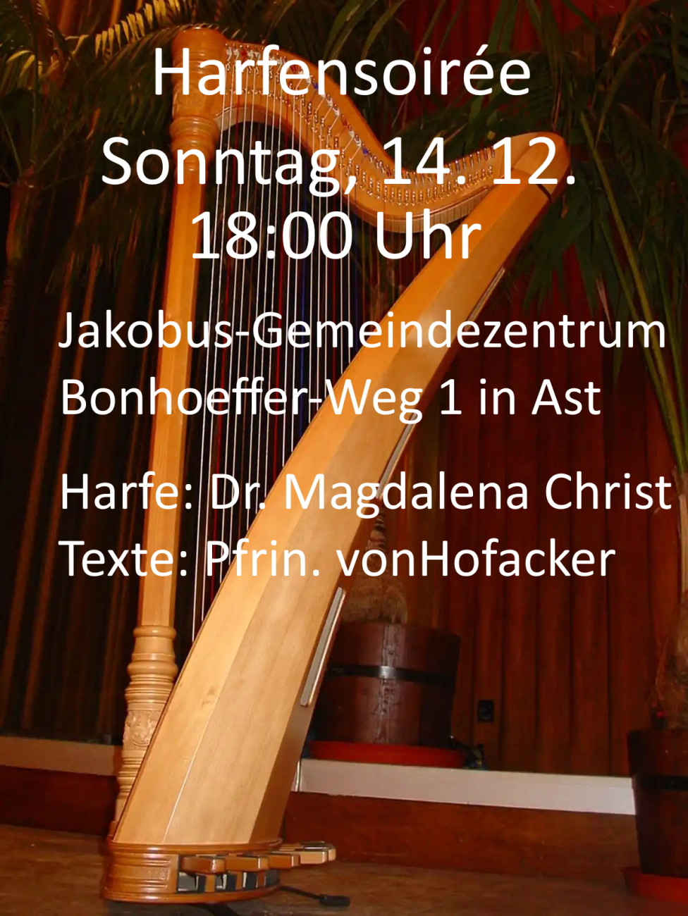 Schon das vierte Jahr heisst es in der Advents-und Weihnachtszeit: Harfenabend mit Dr. med.dent. Magdalena Christ (Landshut) im Jakobus-Gemeindezentrum in Ast. Und die Besucher und Besucherinnen können auch wieder dieses Jahr gewiß sein: es wird ein einzigartiger Abend werden!